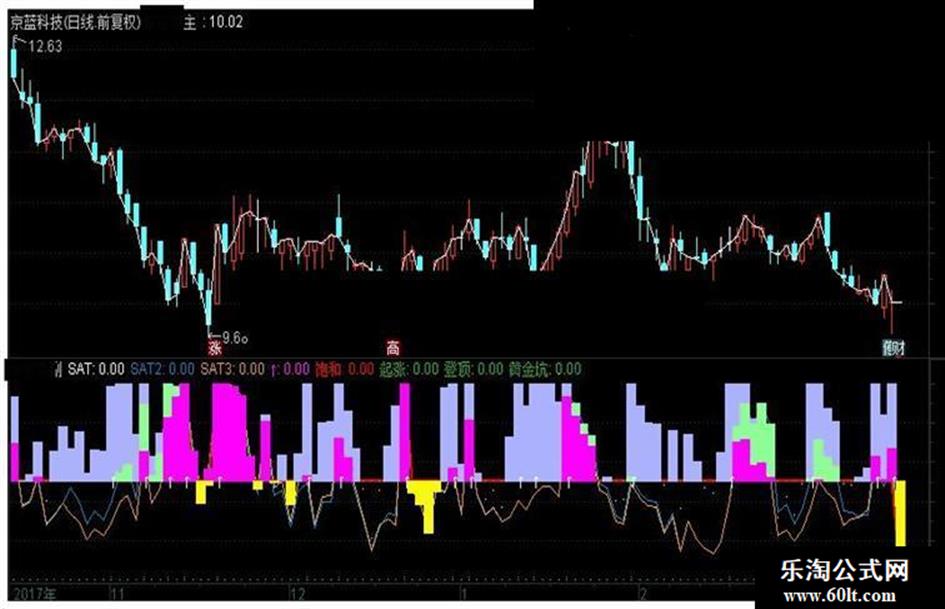 黄金坑:IF(COUNT(NOT(饱和=50),10) AND SAT<50,SAT,50),COLOR00FFFF,POINTDOT,LINETHICK0;
