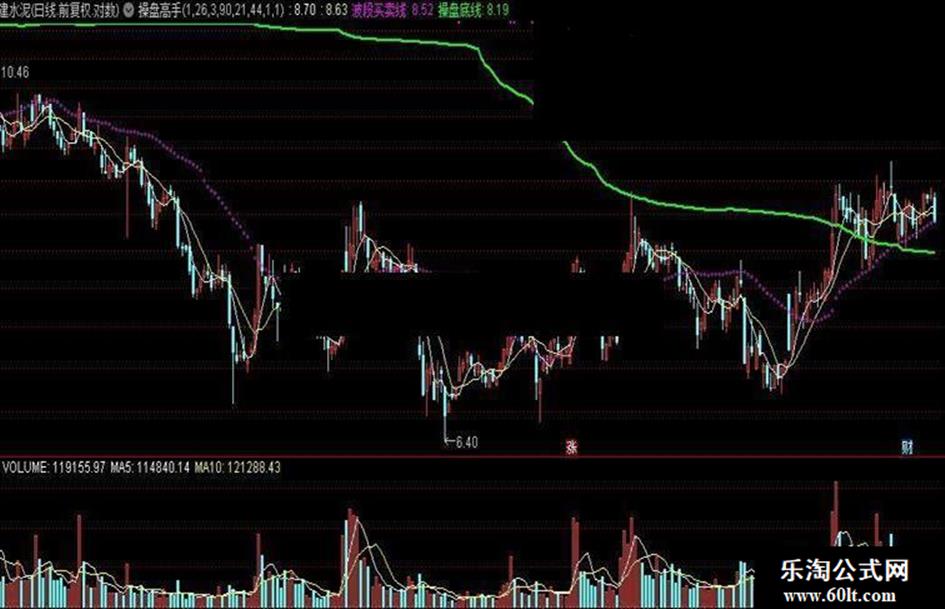 (VOL,34),CIRCLEDOT,ColorFF00FF;操盘底线:SUM(VOL*(OPEN+CLOSE)/2,