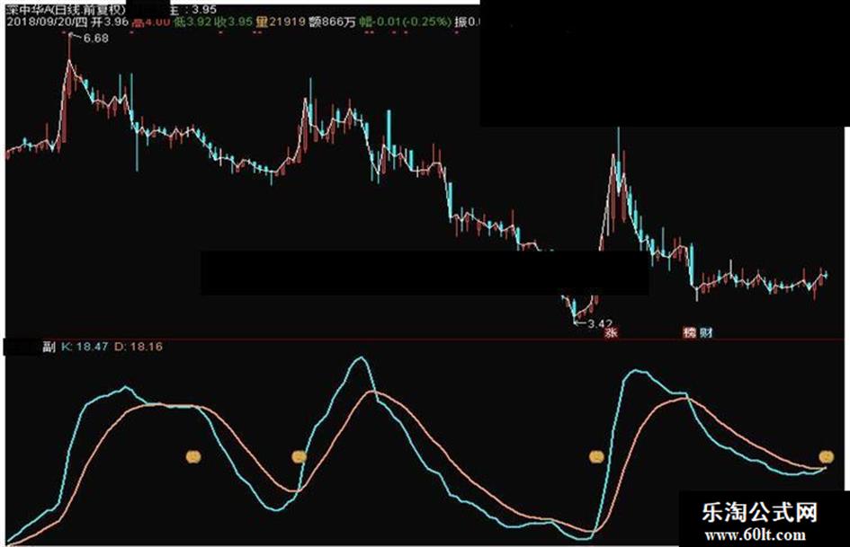 N:=85;M1:=7;M2:=6; RSV:=(CLOSE-LLV(LOW,N))/(HHV(HIGH,N)-LLV(LOW,N))*100; K:SMA(RSV,M1,1),LINETHICK2,COLOREEEE33; D:SMA(K,M2,1),LINETHICK2 ,COLOR6699FF; J:=3*K-2*D; 买入:=CROSS(J,D )AND CROSS(J,K)AND K <40 AND D<50 AND J<50; DRAWICON(买入=1,20,4);