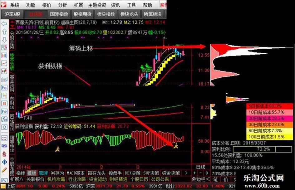 操盘注意事项:我的标准是主力筹码不向上转移就持股等待。一旦主力筹码向上转移先出局观望。在股市中吃完整条鱼是不可能的,但我们要保证吃到鱼身。本指标是根据天狼50软件的理念优化的指标,专门针对牛市中筹码锁仓拉抬的股票进行中线检测。主力连续将低位筹码向上转移,获利纵横指标会连续的小于50,指标下会出现奔跑的小人,提示主力可能大洗牌或者出逃。那么这时我们从低位赢利后就可以先出局观望,以保证盈利所得。最后再次强调本指标适用中线锁仓拉升,检测主力是否洗牌或出逃