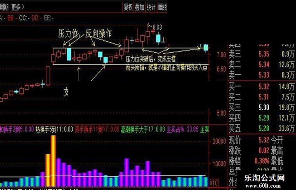 “T十0”之K线买卖方法一。在某个时间段成交量最大的这根K线的最高最低价就有压力或者支撑,股价回调到该K线会获得支撑,反之股价反弹到该K线会有压力,当股价处于该K线之间上有压力下有支撑。压力位就做反向操作,支撑位就做正向操作。
