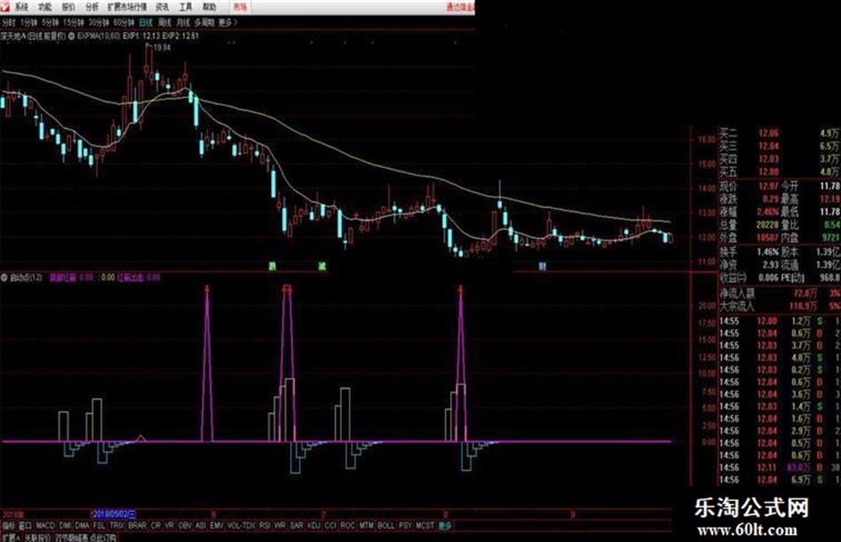 底部红箭:IF((MA(C,5)-C)/C>0.04 AND (MA(C,10)-MA(C,5))/MA(C,5)>0.04,23,0),LINETHICK2,COLORFF00FF;
