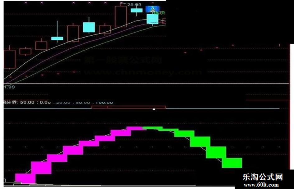 VAR1:=(HHV(HIGH,9)-CLOSE)/(HHV(HIGH,9)-LLV(LOW,9))*100-70; VAR2:=SMA(VAR1,9,1)+100; VAR3:=(CLOSE-LLV(LOW,9))/(HHV(HIGH,9)-LLV(LOW,9))*100; VAR4:=SMA(VAR3,3,1); VAR5:=SMA(VAR4,3,1)+100; VAR6:=VAR5-VAR2; 趋势: IF(VAR6>45,VAR6-45,0); STICKLINE(REF(趋势,1)< 趋势, 趋势,REF(趋势,1),5,0),colorff00ff; STICKLINE(REF(趋势,1)> 趋势, 趋势,REF(趋势,1),5,0),color00ff00; 强弱分界:50,POINTDOT,Colorffffcc; 0,Color00Ffff; 20,POINTDOT,COlORFFAA66,linethick1; 80,POINTDOT,COlORFFAA66,linethick1; 100,Colorffff33; v1:=llv(low,10); v2:=hhv(h,25); 价位线:=ema((c-v1)/(v2-v1)*4,4); DRAWTEXT(CROSS(价位线,0.3),7,'●'),ColorFFFfff; DRAWTEXT(CROSS(3.5,价位线),102,'●'),ColorFFFfff; Var2q:=REF(LOW,1); Var3q:=SMA(ABS(LOW-Var2q),3,1)/SMA(MAX(LOW-Var2q,0),3,1)*100; Var4q:=EMA(IF(CLOSE*1.3,Var3q*10,Var3q/10),3); Var5q:=LLV(LOW,30); Var6q:=HHV(Var4q,30); Var7q:=IF(MA(CLOSE,58),1,0); Var8q:=EMA(IF(LOW<=Var5q,(Var4q+Var6q*2)/2,0),3)/618*Var7q; Var9q:=IF(Var8q>100,100,Var8q); 吸筹:STICKLINE(Var9q>-120,0,Var9q,6,1),coloryellow; AA3:=(HHV(HIGH,21)-CLOSE)/(HHV(HIGH,21)-LLV(LOW,21))*100-10; AA4:=(CLOSE-LLV(LOW,21))/(HHV(HIGH,21)-LLV(LOW,21))*100; AA5:=SMA(AA4,13,8); 走势:=CEILING(SMA(AA5,13,8)); AA6:=SMA(AA3,21,8); 卖临界:STICKLINE(走势-AA6>85,103,100,15,1),Color0000ff,linethick2;