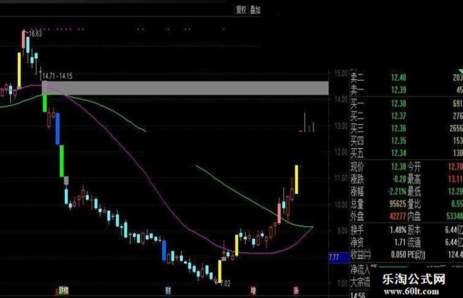 普通K线图不显示涨跌停,所以把涨停设置为黄色K线,跌停设置为绿色K线。一般大于5%的K线对于趋势扭转比较又意义,但是普通主图也是不显示的,所以把>5%的阳线设置成粉色,>5%的阴线设置成蓝色,置于K线上一目了然,非常清晰。 另外加入了跳空缺口灰色显示,左上角加入板块信息显示。希望能给大家带来方便。