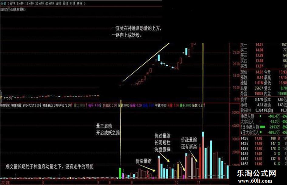 与传统的系统成交量指标比,神渔量能指标把成交量的变化规律用不同的颜色标示区分出来,并引入倍量、缩量、平量、百日低量、天量、量王的概念,使成交量的变化规律无所遁形,一目了然;传统的系统成交量指标用的是成交手数(受除权除息增发影响失真比较大),而神渔量能指标启用成交金额,更能真实的反应当天的成交情况,并弃用传统的一些指标线,独创一条动态的神渔启动线,成交量只有超过这条启动线,才有走牛的可能,这就给我们及时发现和抓住牛股、妖股提供了一个难得的契机,是量学喜爱者“攻城掠地”的必备良器。本指标参考了量学的成交量指标思路,在此表示诚挚的谢意!