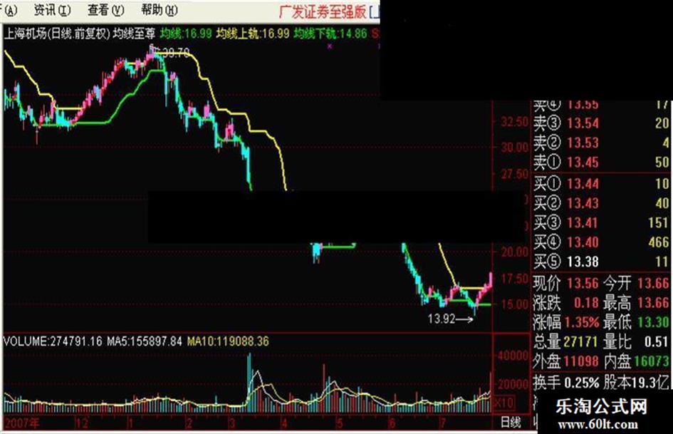 均线下轨:LLV(均线,14),LINETHICK2,COLORGREEN;