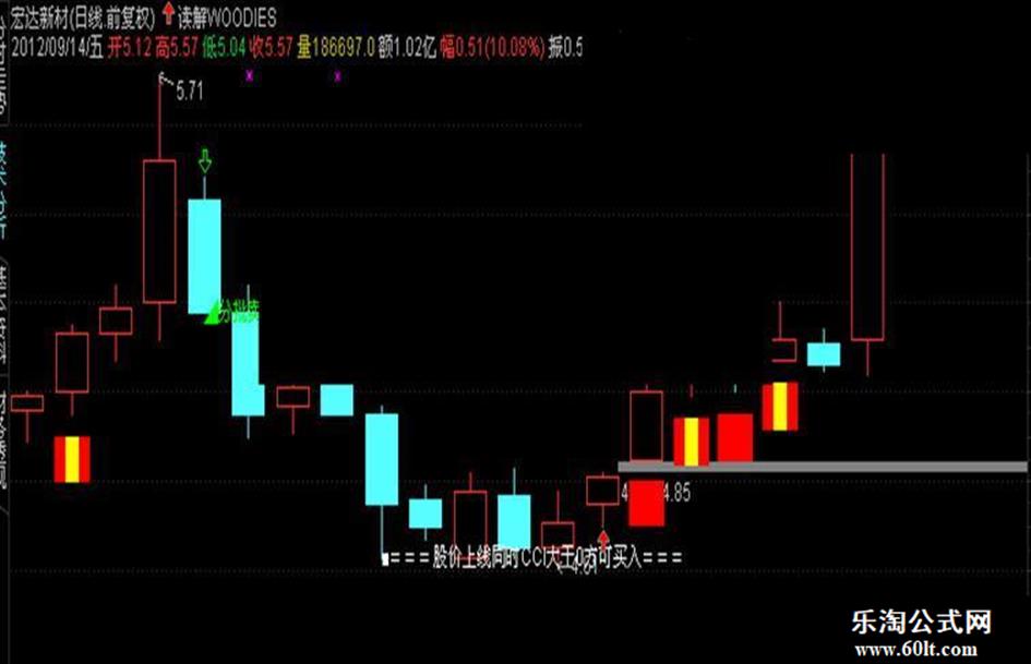 DRAWTEXT(CROSS(-100,CCI) AND CCI<REF(CCI,1),L,'■===股价上线同时CCI大于0方可买入==='),COLORWHITE;