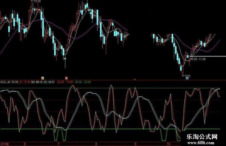 该指标是前段时间在微信群听老师讲课时,老师无私分享的指标,用了一段时间感觉非常好用,今天分享给各位,希望各位股市长红!! 简单用法:20以下金叉买入最佳,70以上分批卖出,80以上清仓。 激进买点JK上穿JD时买入; 稳妥买点SK上穿SD时买入; 最佳买点 当日JK上穿JD并且SK上穿SD时买入;