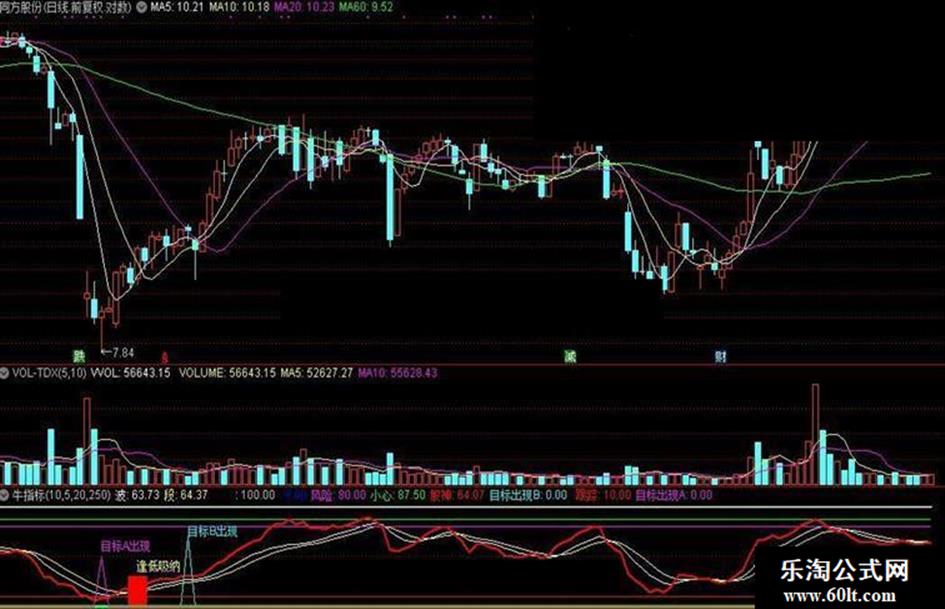 目标出现A:IF((COUNT((股神>REF(股神,1)),1)=1) AND (REF(股神,1)<REF(REF(股神,1),1)) AND (股神<跟踪),50,0),COLORF00FF0;