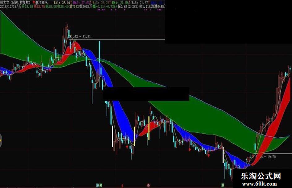 根据开心果老师改编! 五条均线参数分别为5,10,21,55,120。其中10与21围成短期通道,55与120围成中长期通道.在本图中可以看到短期通道受到长期通道的压制和穿越。 操盘方法还是要根据均线系统,原理是一样的,只是比系统自带的均线更直观清晰地看到均线通道的压力或支撑,感受趋势的力量! 名字为春江潮水