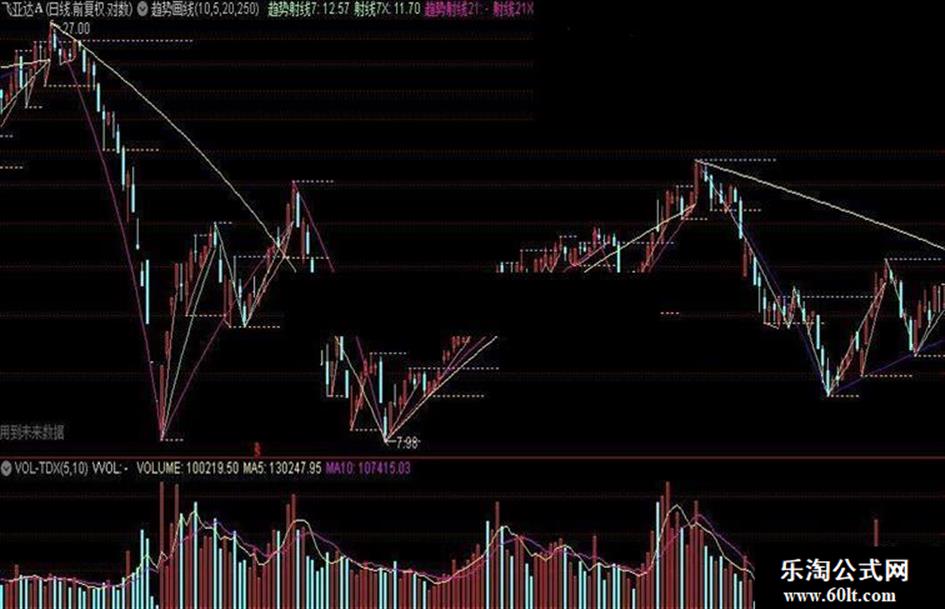 趋势射线7: DRAWLINE(H=HHV(H,7),H,L=LLV(L,7),L,0),COLOR9AFF89;