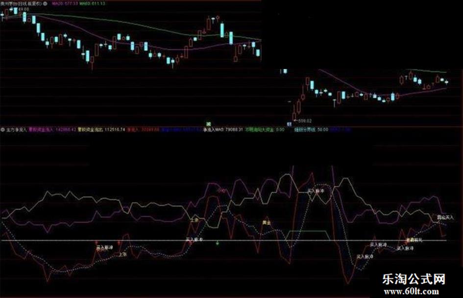 DRAWTEXT(CROSS(主力,散户) AND 主力< 35,净流入*0.84,'买入脉冲');