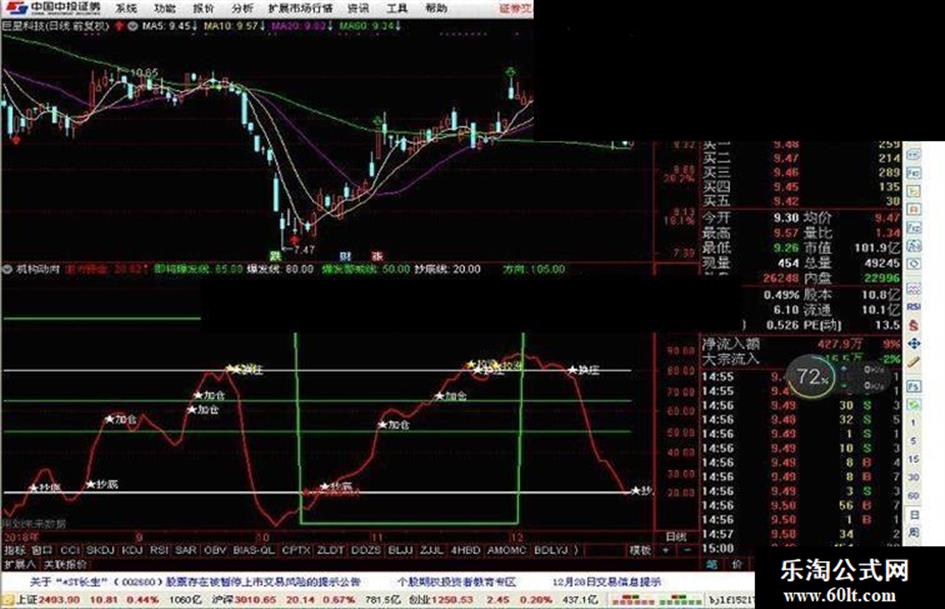 DRAWTEXT(CROSS(主力资金,警戒线) AND 方向 < 50,主力资金,'★关注') ,COLORWHITE;