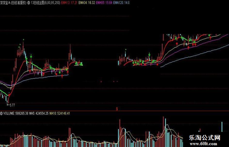 EMA13:EMA(C,13),COLOR0000FF,LINETHICK2; EMA34:EMA(C,34),COLORYELLOW; EMA55:EMA(C,55),COLORFF00FF; EMA120:EMA(C,120),COLORFFCC66;
