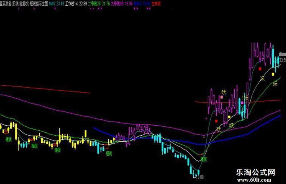 OR (CROSS(SK,SD) AND SK<=0.05 AND (V/MA(V,5)>2 OR C/REF(C,1)>0.035)) ,L*0.99,'短线'),COLORGREEN;