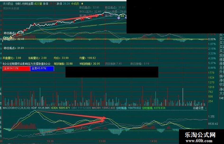 “MACD”是观察股票趋势运行的指标,而“OBV”则是一个量能分析指标。两个系统指标结合源代码做适当修改,以适应通达信分时只能显示一个指标,其应用分析判断如下: