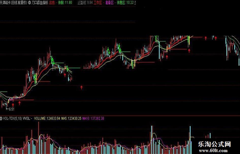 准备区:IF(C>=工作线 AND EMA(C,14)<EMA(C,25),工作线,DRAWNULL), COLORMAGENTA;
