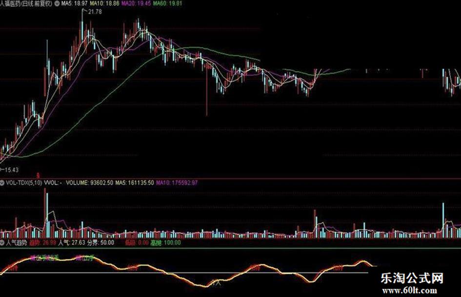 低吸: IF(CROSS(趋势,人气) AND 趋势<15,20,0),COLORRED;