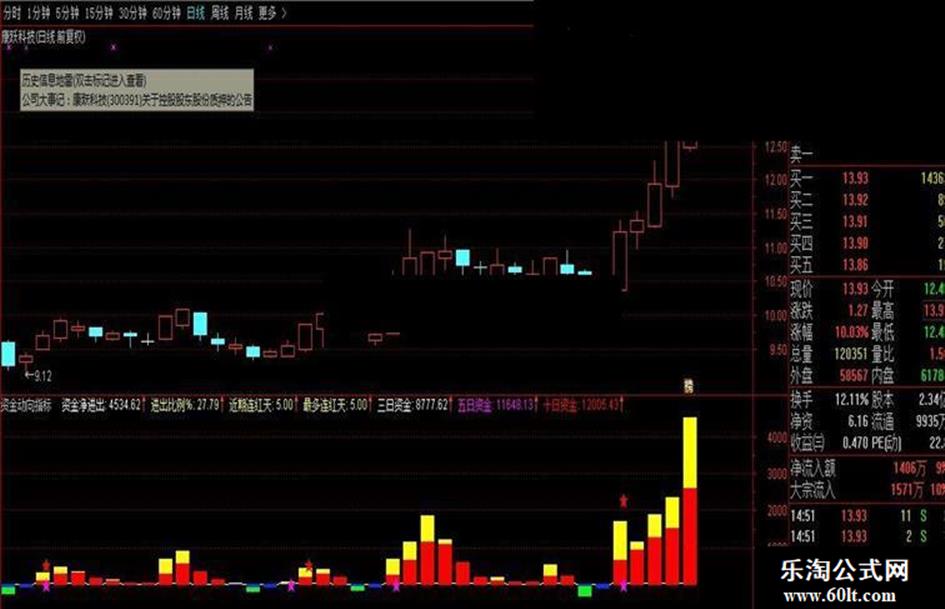 进出比例%:IF((HSL*0.4+LLJX)>0,资金流入/万元*100,资金流出/万元*100),COLORYELLOW;