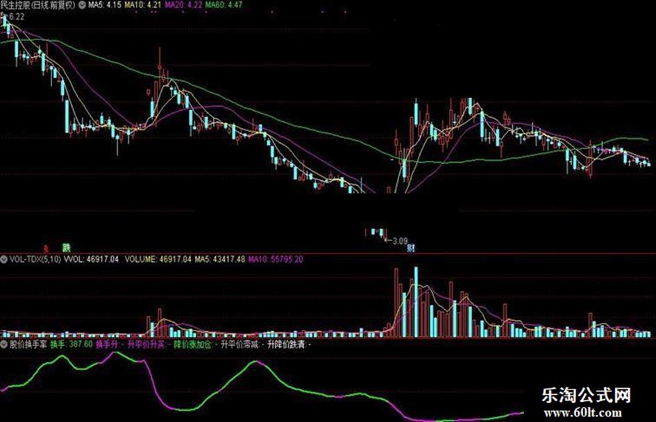 换手升:IF(GJ>=REF(GJ,1),JH,DRAWNULL)LINETHICK2,COLORMAGENTA;