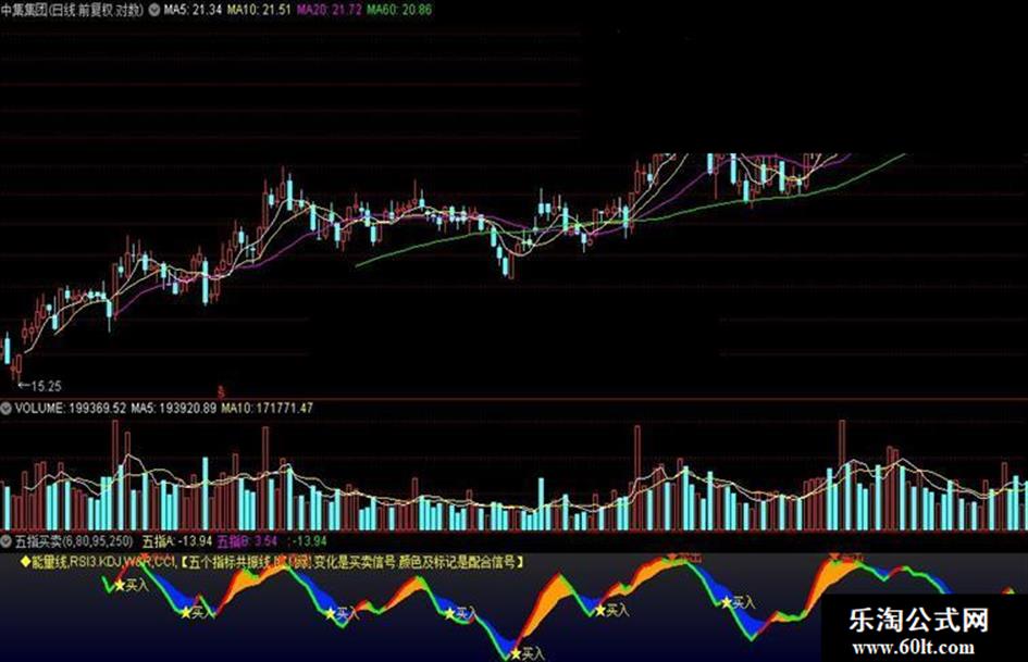 (能量线+RSI+J-威廉WR+CCI)/5的5日加权移动平均,COLOR00FF00,线宽为3