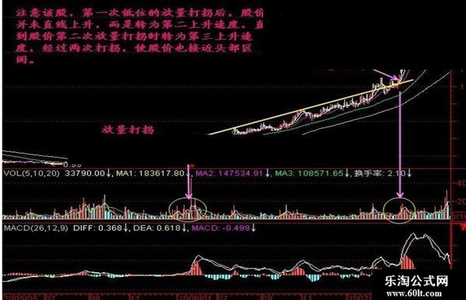 庄家建仓后总要拉升获利,这样才能在高位派发,而在股价建仓区间,往往有一条压力线在上面压制着股价,不让股价超过该压力线,庄家就在压力线之下、60线之上逐步推高股价 在建仓完毕后,可能会洗盘,也可能直接进入拉升,而这条压力线如果被放量突破(或者缩量突破),都意味着庄家已经开始拉升股价了 这就是放量打拐 一旦开始拉升股价,就必须上涨远离成本区,否则庄家没法出货,我们就守候在这根压力线(高点连线)附近,什么时候突破,就什么时候积极跟进