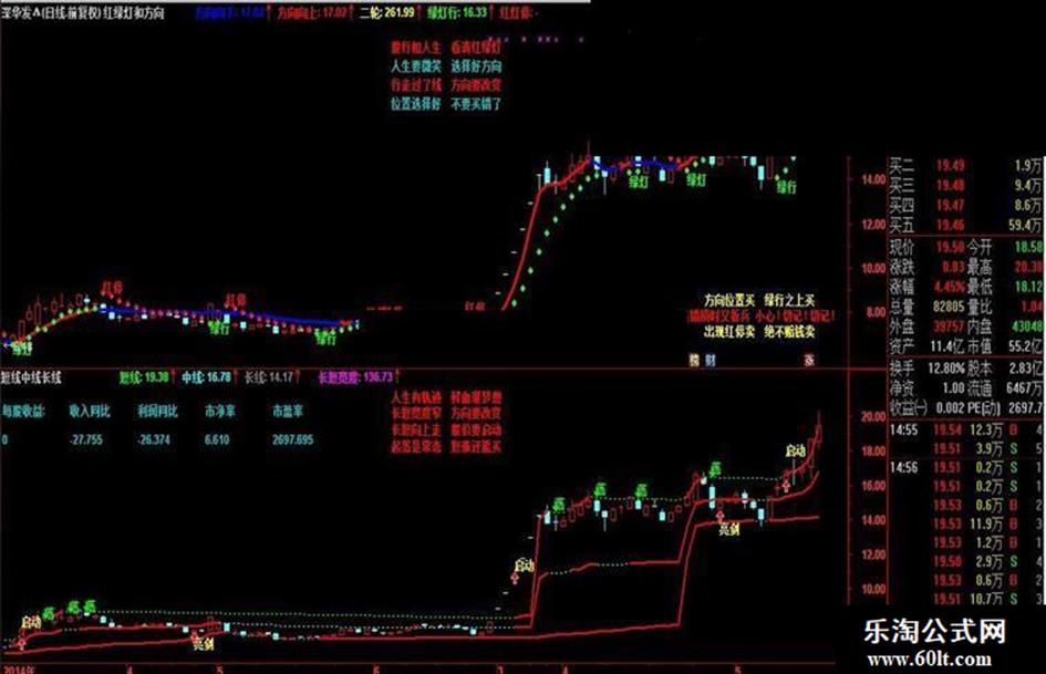 经过实盘操作,本人总结了几句这两个公式的用法,红绿灯中间方向线变红为上升趋势,方向线变红,下有绿灯可以买入并持股,出现红灯可以考虑卖出,经实盘测试,比BS效果好,还有几句总结一并写入公式了,望大家细加体会!