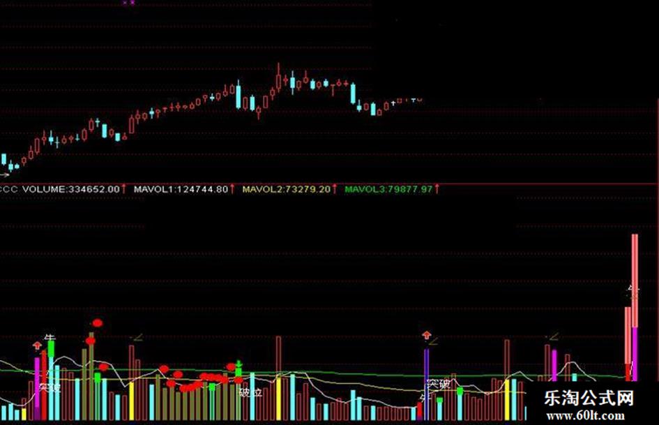 用法说明:黄色为立桩量,绿色长竖条为逃顶提示,蓝色与红箭头为突破,红色为牛,紫色为立桩三天法则成立,笑脸为寻底,棕色与绿箭头为破位,淡红色黑中线涨停,深绿色黑中线跌停,∠为45度上升,亮绿色为顶背离,紫色为底背离,红绿点为筹码提示,红点表示获利筹75以上,绿点表示75以下。