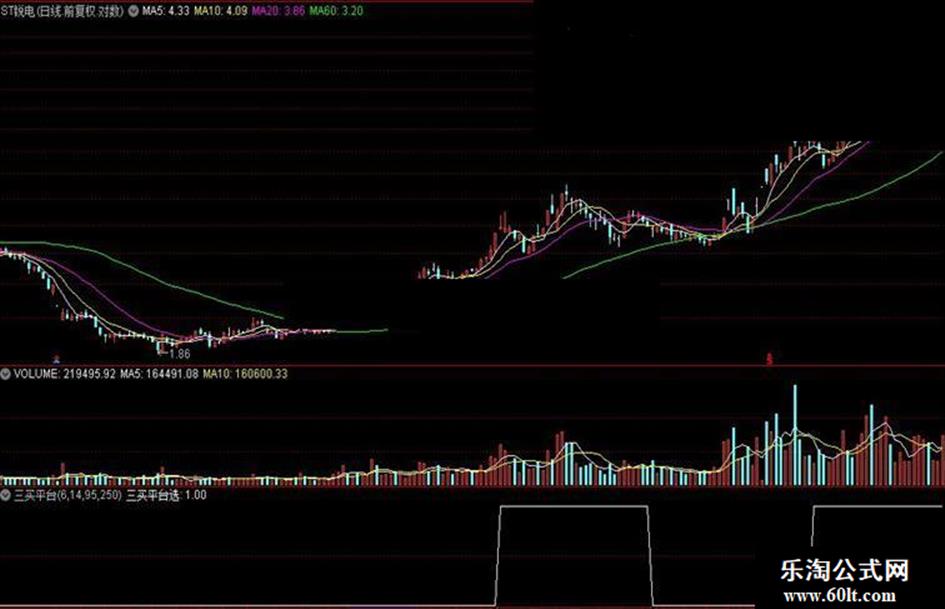 N1:=9;{最近下跌天数} N2:=30;{上涨天数} N3:=56;{平台高点天数} LL:=LLV(L,N1); HH:=HHV(H,2*N1); H0:=REF(HHV(H,N3),N1+N2); 三买平台选:HH=HHV(H,N2+N1+N3) AND LL>H0 AND LL/HH<0.97;