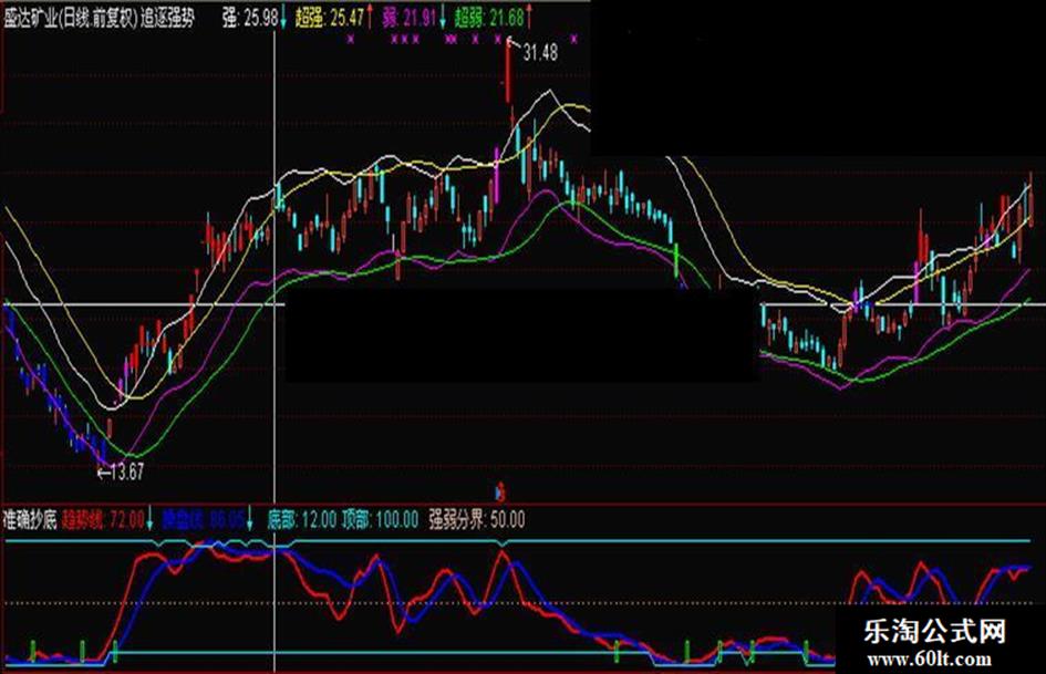 底部:IF((趋势线-VAR6<(-65)),1,12),COLORF0F000;