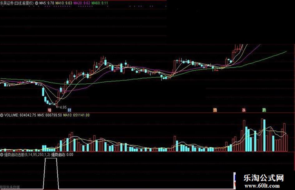 强势启动:IF((REF(SS,2)<REF(SS,1)AND SS>REF(SS,1))*SS>60 AND C<买入*1.06,1.8,0),COLORWHITE,LINETHICK2;