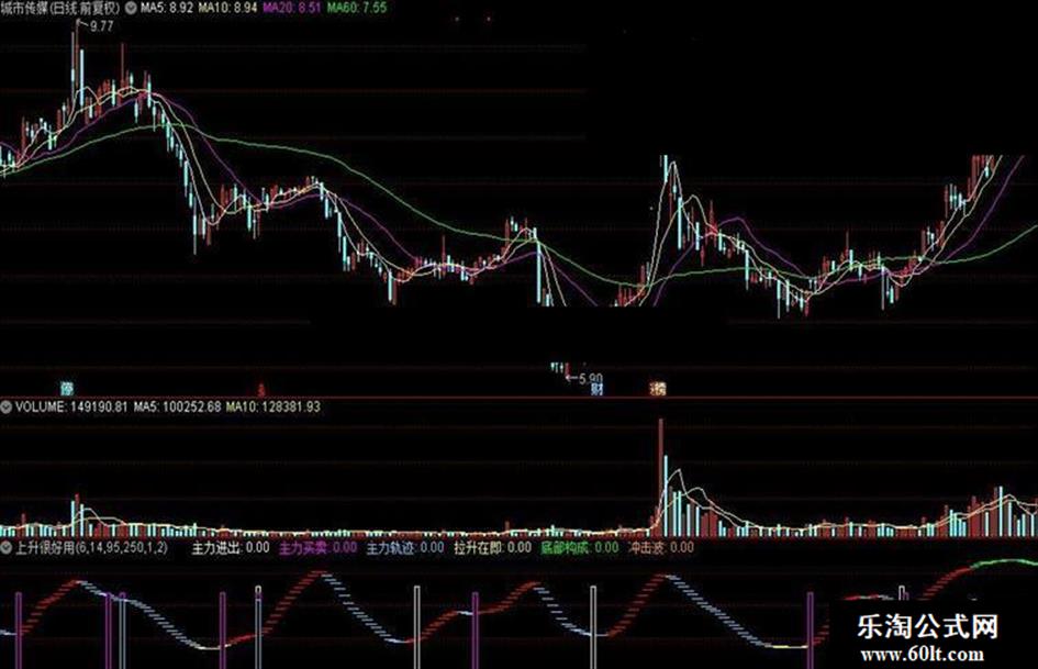 主力轨迹:IF(ABV>M2 AND MMS>MML AND CROSS(ZLGJ,MAZL) AND ZLGJ>REF(ZLGJ,1) AND MAZL>REF(MAZL,1),55,0),COLORFFCC66,POINTDOT;