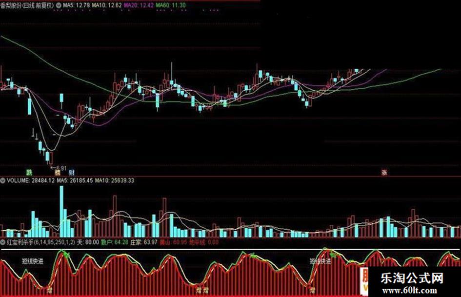 DRAWTEXT(CROSS(庄家,散户) AND 散户>65,70,'减'),LINETHICK2,COLORGREEN;
