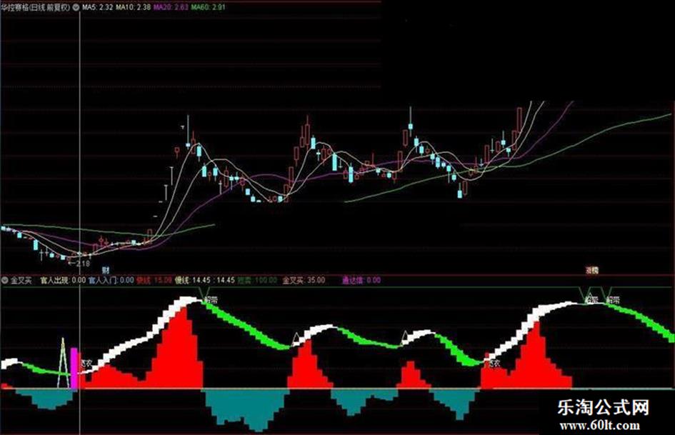 金叉买副图趋势找买点,出现“宽衣”或者金叉买信号买入,出现“解带”信号卖出。金叉买副图配合低位横盘主图使用是最佳组合