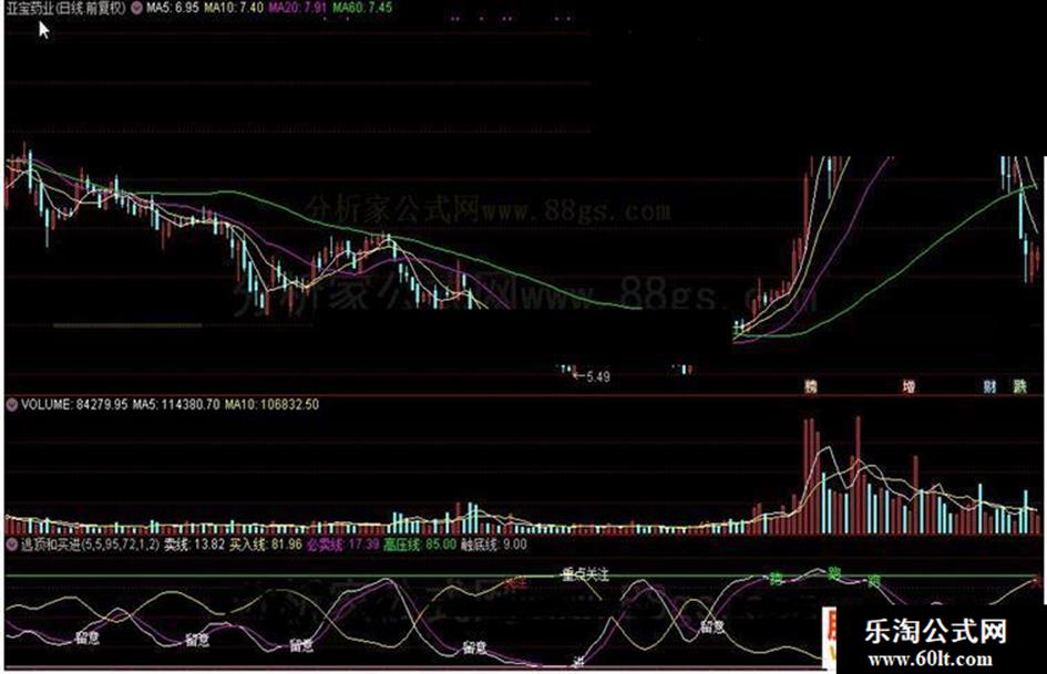 DRAWTEXT(买入线>76.5 AND CROSS(卖线,必卖线),必卖线*1.15,"进");