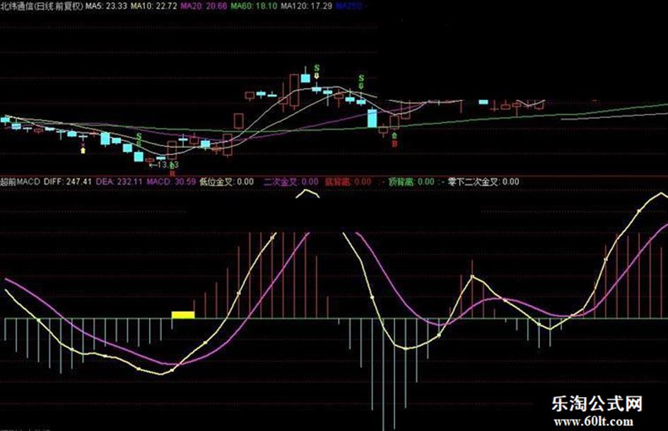 低位金叉:IF(CROSS(DIFF,DEA) AND DIFF<-0.1,0.3,0),COLORYELLOW,POINTDOT;