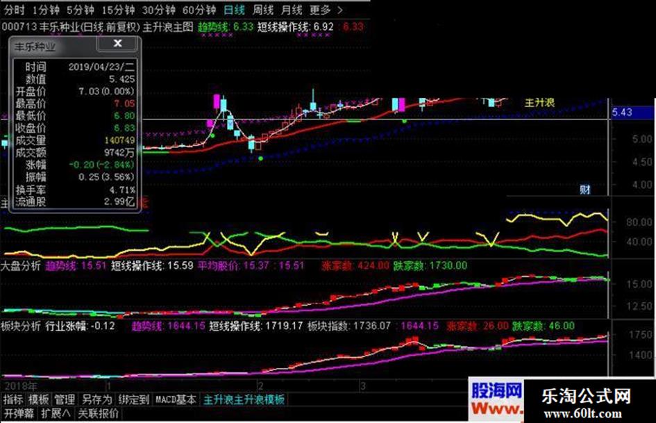 1.主升浪:代表主图趋势线由绿色变为红色后首次出现黄色点或红色点,选出个股应及时介入。
