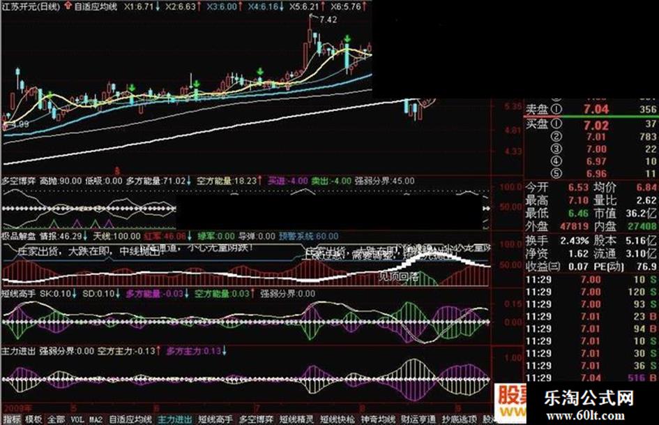 自适应均线系统包含短线(黄色),中线(兰色),长线(白色)三套均线1、细黄色线上穿粗黄色线,短线买入,下穿,卖出;2、细兰色线上穿粗兰色线,中线买入,下穿,卖出;3、细黄色线上穿粗黄色线时,如果在兰色线附近,则最好;4、所有买入时,KD必须在20以下形成金叉是最佳选择![下面上图,一牛一熊:觉得好别忘了顶一下。]
