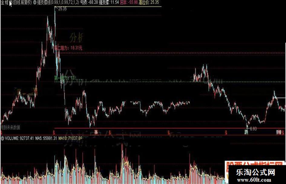 强支撑:DRAWLINE(CURRBARSCOUNT=CONST(VH)+1,REF(JJ,VH),ISLASTBAR,REF(JJ,VH),0),COLORWHITE;