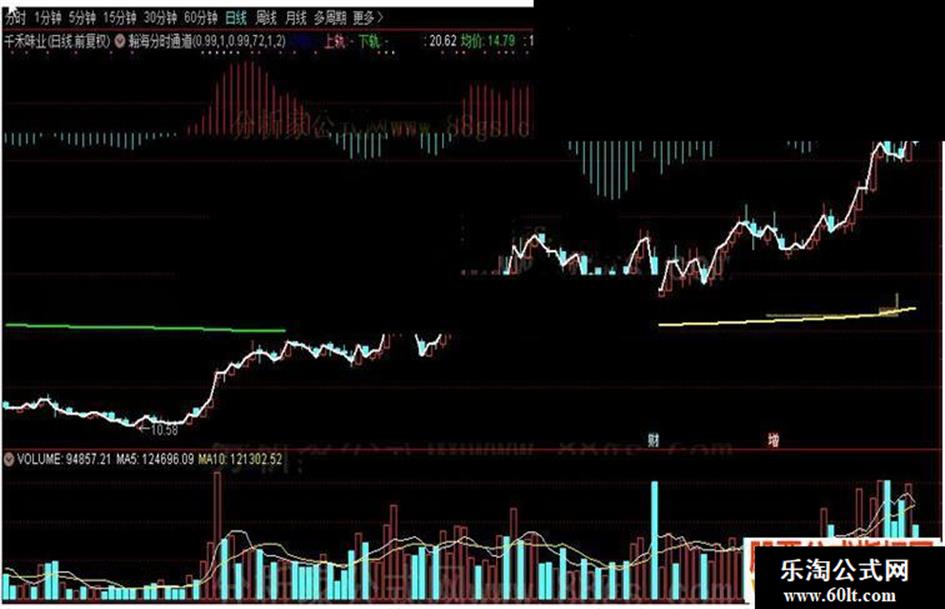 下轨:IF(NP>FP,IF(UTL<=RH,UTL,DRAWNULL),IF(UTL>=RL,UTL,DRAWNULL)),COLOR00EE00,LINETHICK1,DOTLINE;