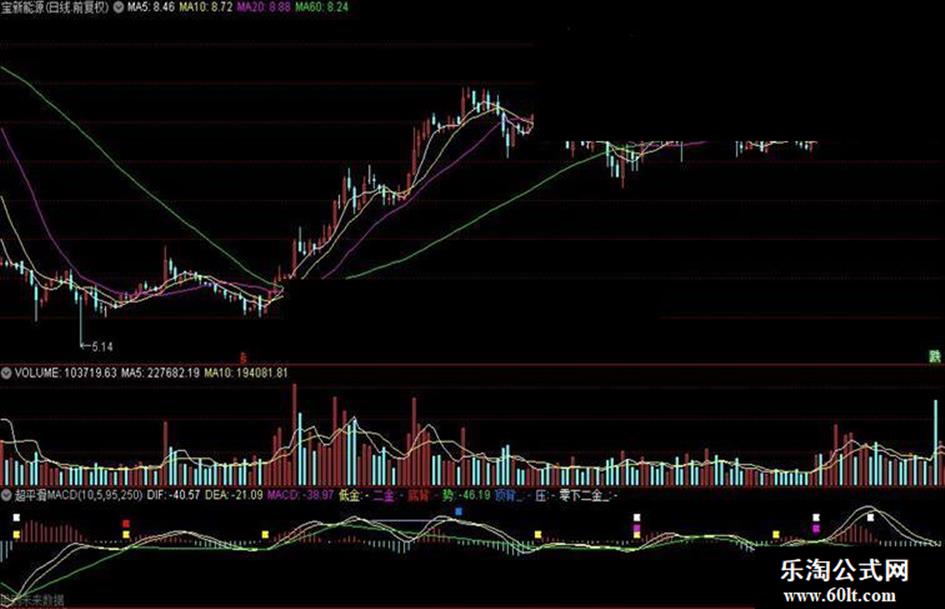低金:IF(CROSS(DIF,DEA) AND DIF<-0.1,15,DRAWNULL),COLORYELLOW,LINETHICK4,CROSSDOT;