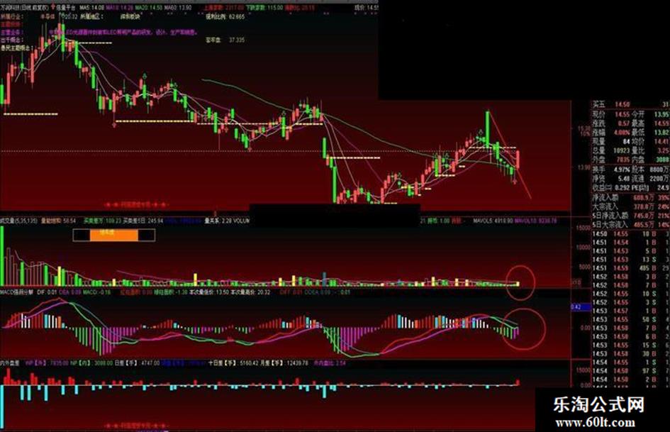 当满足条件净流>0时,在0和净流位置之间画柱状线,宽度为1.5,0不为0则画空心柱.,COLOR0000FF