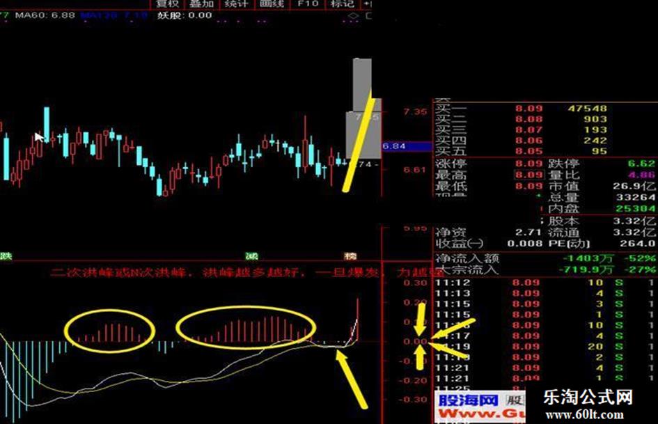 一次选出来的股票有40只左右,从里面筛选, 结合市场热点来优选,N次洪峰次数越多越好,说明在积攒爆发力, 一般二次洪峰都很厉害,金叉的位置与0轴的距离太低太高都不好, 0轴附近的金叉最好。
