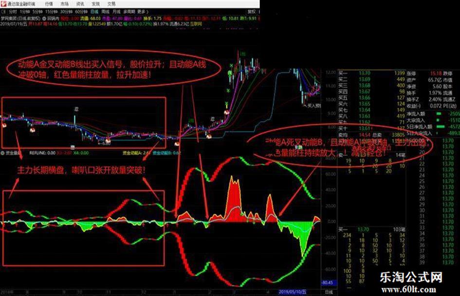本指标使用很简单,多看几次图就明白。 建议选择股性好的标的。 喇叭口收窄且极度缩量的标的开始密切留意,合久必涨!一但的动能A金叉动能B线,标的异动反转;动能A冲上0轴且出现红色量能柱持续放大,股价开启一波拉升旅程。 反之,股价开始回调下跌。