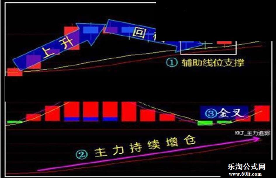 注:如⑥处需破位(突破辅助线位的压力)上行,必须配合主力(主力追踪/主力统计)持续增仓。否则,如果没有主力的配合,就会形成如④的形态,遇压再次下行,也可参考死叉出货。
