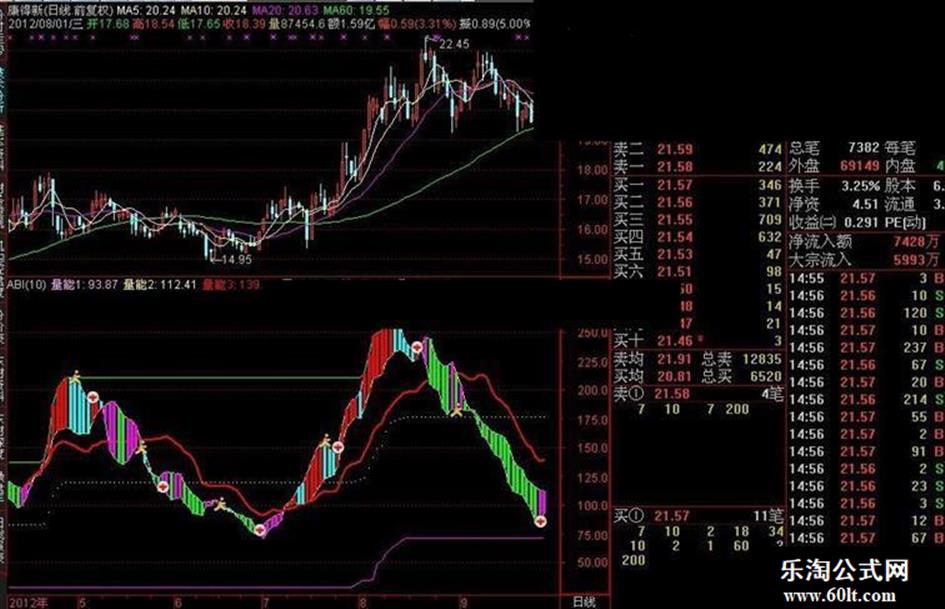 量能1<量能2,量能2,量能1,0.1,0),COLORFF00FF;{开始转强势}