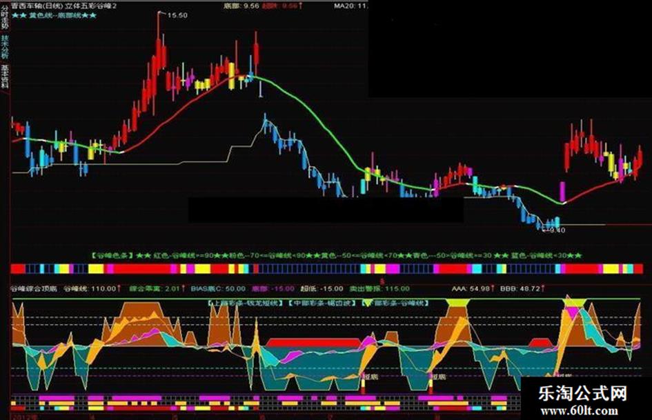 在《喜庆佳节2》指标中,涉及到的《谷峰线指标》如何用更好的发挥指示顶底作用,现实验编辑了一个主图指标《立体五彩谷峰》指标,在指标中将谷峰线的走势大概分为六个区域,50线上下各三个区,也可以把50上的三个区分别定义为,买进(黄色K线},加仓(粉色K线)及警惕区(红色K线)。50线以下可以大概分为减仓区(青色K线)及持币区(蓝色K线)。这样,主图显示的五彩K线即美观又适应,同时也可以提示我们股价的不同走势及应采取的对策。底部的彩条也是同五彩K线相对应,提示起到提示作用。望能对你更好的判断顶底起到一定的帮助作!!!