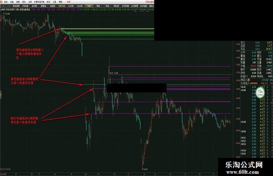 枚红色水平画线表示阳量 绿色水平画线表示阴量,黄色加粗水平画线表示阴量最高画线。根据画线可以参考N周期阳量 阴量集中在哪个价位,参考买进 卖出