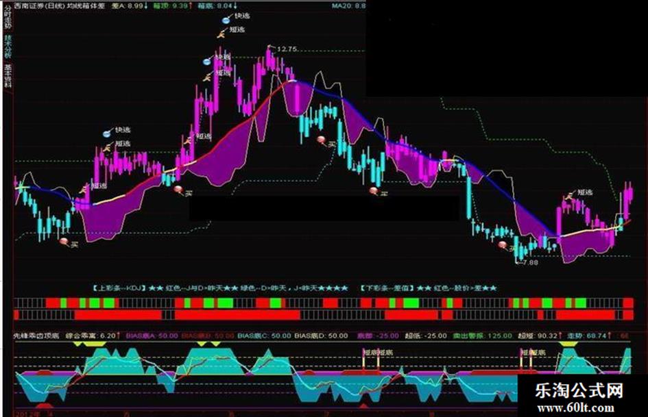 均线箱体差值主图指标试想通过均线、均线角度线、箱体、KDJ指标及差值综合显示买卖信号: