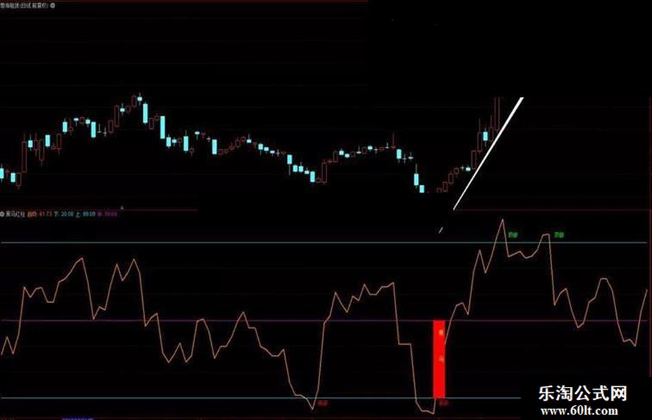 2、指标中的黑马红柱和底部均为我们的买点信号,当出现该信号时,此时就是我们的介入时机。